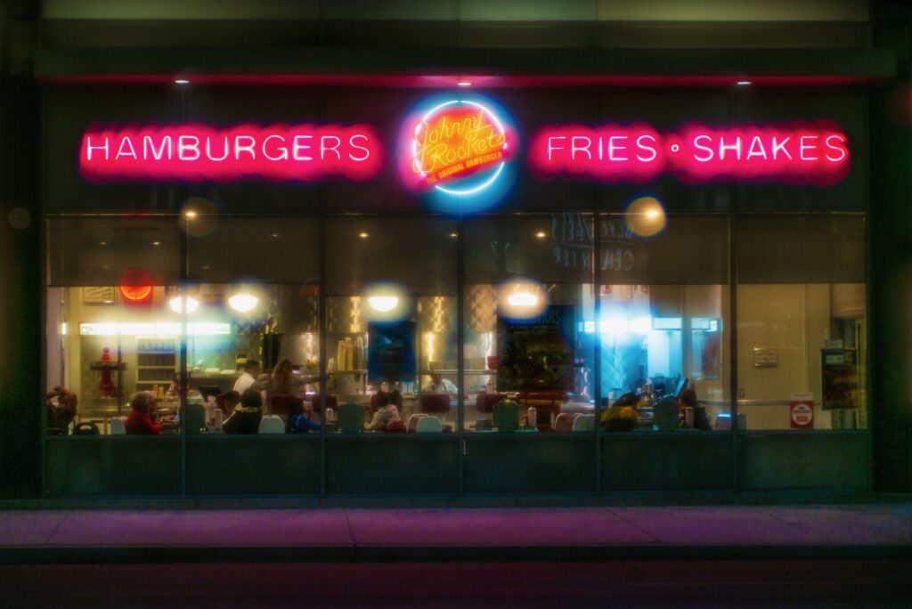Then I saw it. A Johnny Rockets diner. Its window, usually layered with flyers, decals, and misplaced optimism, was strangely bare. Inside, dim lighting cast a warm glow over chrome counters and red vinyl booths. Patrons looked like extras from a 1950s film that never made it past the audition.
