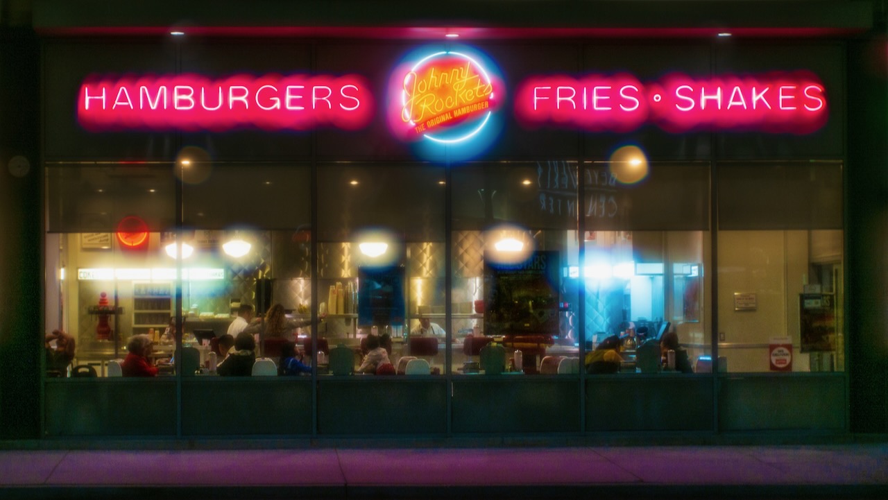 Then I saw it. A Johnny Rockets diner. Its window, usually layered with flyers, decals, and misplaced optimism, was strangely bare. Inside, dim lighting cast a warm glow over chrome counters and red vinyl booths. Patrons looked like extras from a 1950s film that never made it past the audition.